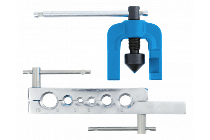 Druk op voor handmatige uitzetting van buizen gemaakt van staal, non-ferrometalen, aluminium en kunststoffen. Voor het vormen van 90° conische flensverbindingen. De set is ontworpen voor installatie-, auto- en bouwwerkzaamheden.