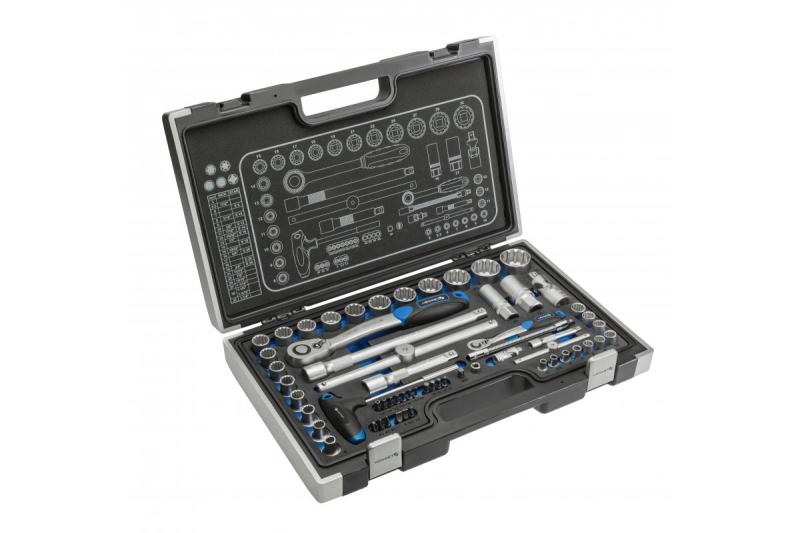 Set van 1/4" en 1/2" doppen, schroevendraaierbits en accessoires. Alle doppen zijn van het spline-type, wat betekent dat ze een richel in het midden van de zijwand hebben en het bevestigingsmiddel ongeveer in het midden van de zijwand raken. Deze gespecialiseerde vorm maakt het mogelijk om doppen aan te passen aan zeskantige, dodecagonale, torx, spline, vierkante en inch-maat moeren en bouten.