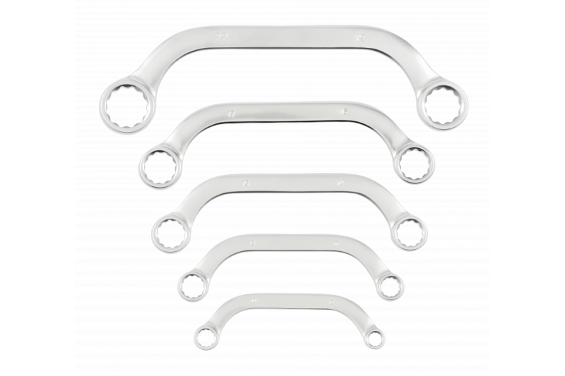 5-delige ringsleutelset. Dankzij het speciale C-vormige profiel kunnen de sleutels worden losgedraaid op moeilijk bereikbare plaatsen, zoals in de buurt van starters, verzamelaars of alternators.