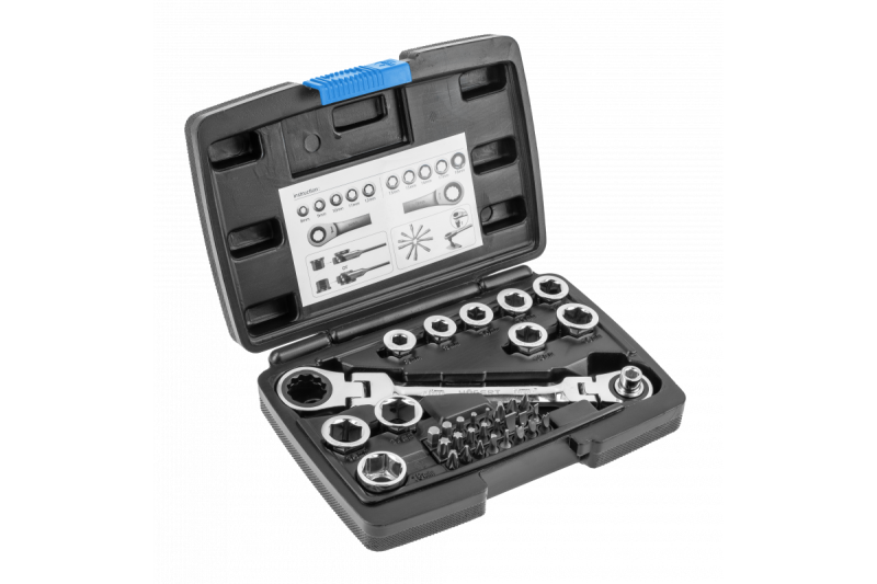 Een ratelsleutel met gewricht en een set speciale doppen is perfect voor het losdraaien en vastdraaien van schroefdraadverbindingen met een zeshoekig bevestigingselement. Dankzij de ratel is het niet nodig om de sleutel van de moer af te halen om nog een slag te maken, terwijl de doppen het mogelijk maken om te werken met schroeven van verschillende maten. De set van 36 stuks maakt het mogelijk om een volledige set sleutels te krijgen in maten 8 - 19 mm. Daarnaast bevat het 24 stuks schroevendraaierbits samen met een adapter. De universele toepassing van de sleutel maakt het mogelijk om deze zowel in de werkplaats als bij renovatie-, bouw- en installatiewerkzaamheden te gebruiken.
