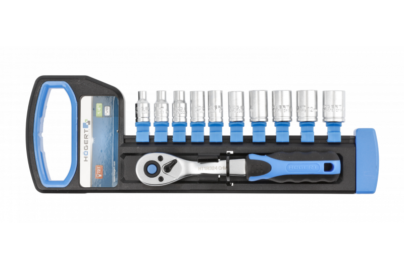 11-delige dopsleutel- en ratelset voor het monteren van schroefdraadverbindingen.