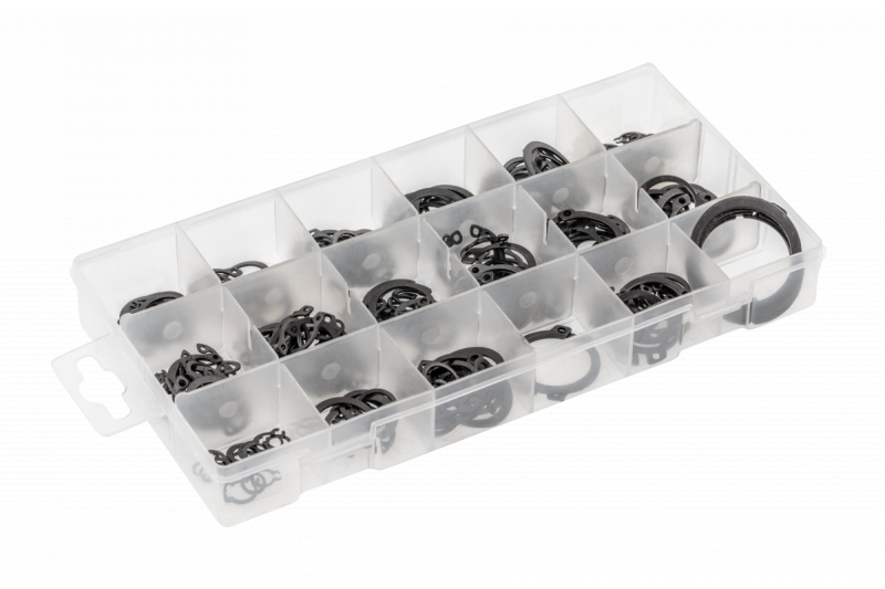 Snap rings (Seeger E-CLIP). Gebruikt voor vergrendeling en beveiliging tegen uitglijden. Essentieel in autowerkplaatsen en reparatiewinkels.