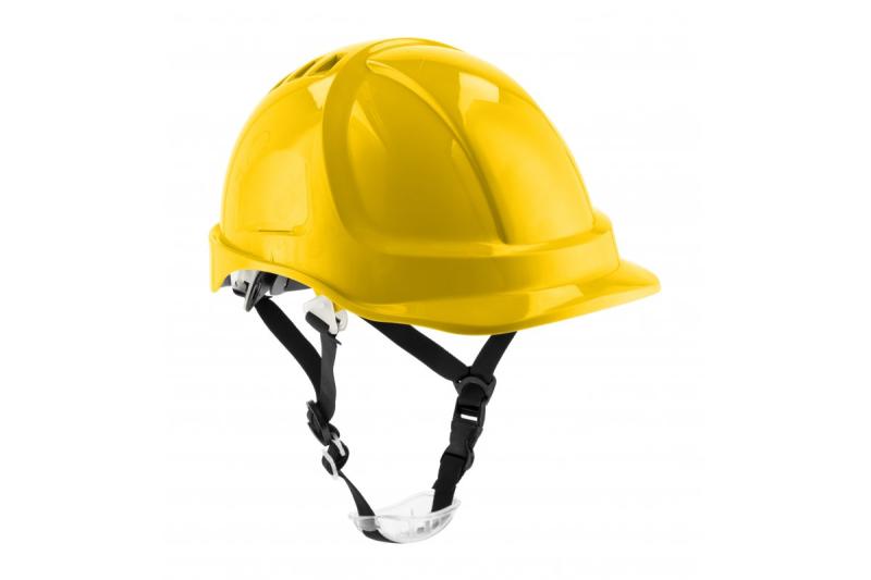 The protective helmet made of ABS plastic has ventilation holes, holes for attaching earmuffs. In addition, the side handles are used to attach additional face, eye and hearing protection. The shell retains impact resistance at low temperatures, has high hardness and scratch resistance. The 6-point truss, made of very durable polyester tapes, does not chafe as in the case of plastic trusses. Adjustable with a knob on the back of the helmet, made of nylon, ensures a perfect fit for any head size. Equipped with a 4 punk chin strap. It is ideal for conditions that require effective protection, excellent ventilation and maximum field of view. Made in accordance with EN 397. Designed for professional use.