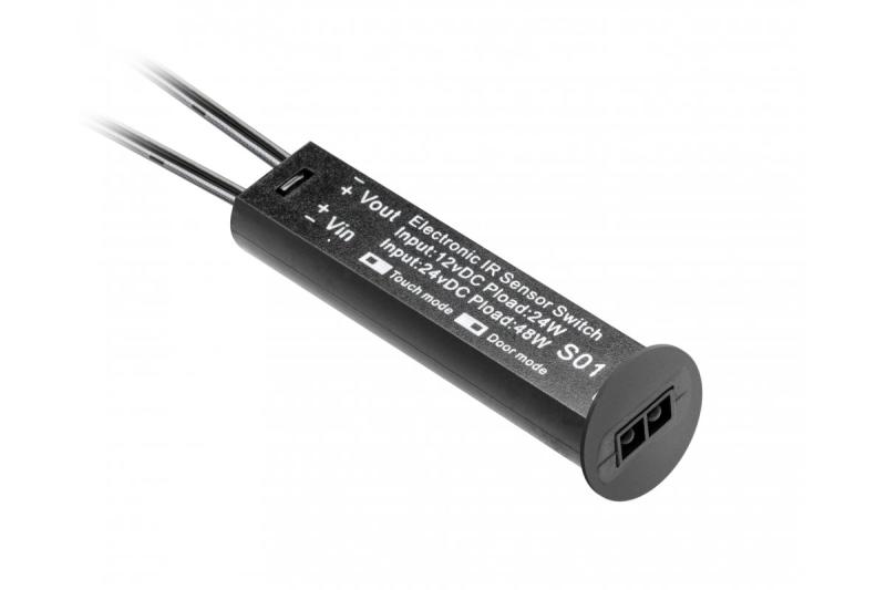 The 3-in-1 non-contact switch can be used as a so-called door switch (as long as it sees an obstacle, the light is off) and responsive to movement, such as a wave of the hand. In two-speed mode, it can also act as a dimmer. The viewing range of the sensor is about 5-6 cm. The switch can be powered by 12V or 24V. The maximum load of the switch when powered by 12V is 24W, while with 24V it can handle up to 48W. The product is sold without a power supply.